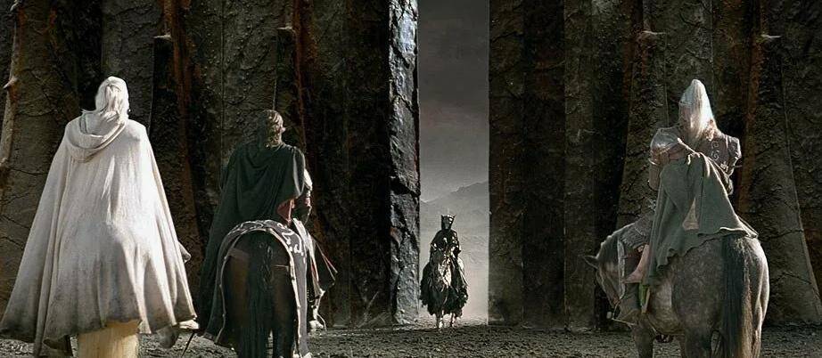 电影加长版里有一段狠戏:索伦之口——昏黑魔君的丑恶使臣,在黑门前试图勒诈联军,成果被阿拉贡一剑斩首。