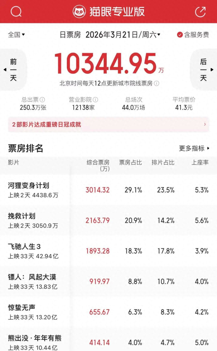 本周末,最热点新片《河狸变身筹画》两天狂扫4438万,不仅驱逐了沈腾《驰骋东说念主生3》的票房日冠,还力压高司令的科幻大片《挽救筹画》!