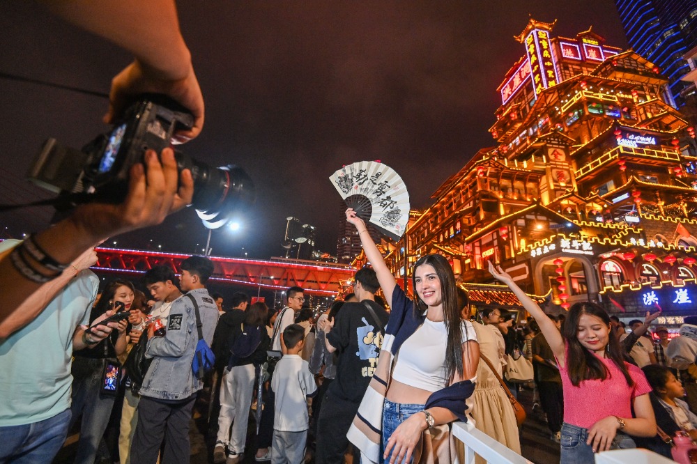 ▲渝中区洪崖洞景区,番邦旅客前来拍照打卡。(本报辛勤图片)首席记者 龙帆 摄