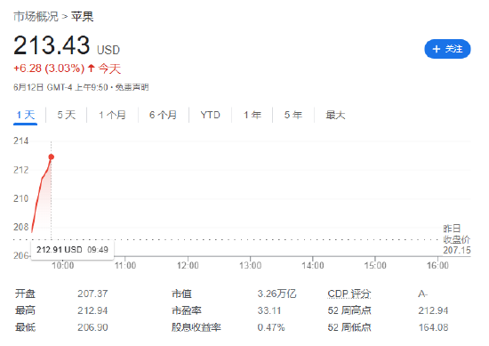 6 月 12 日音讯,本日好意思股开盘,苹果一说念涨上 213 好意思元,市值达到了创记录的 3.26 万亿好意思元(IT之家备注:面前约 23.68 万亿元东说念主民币)。