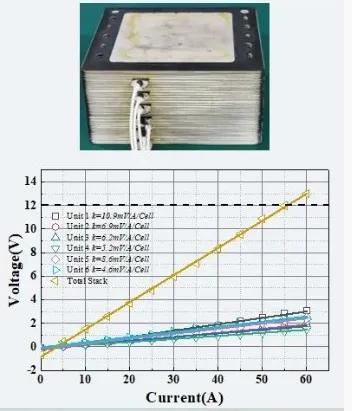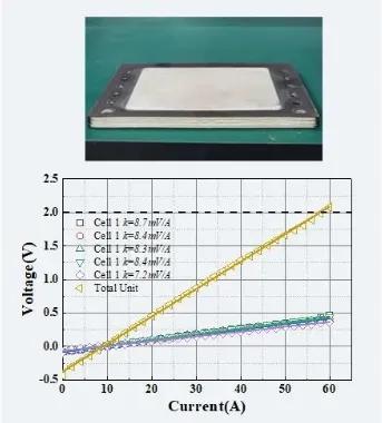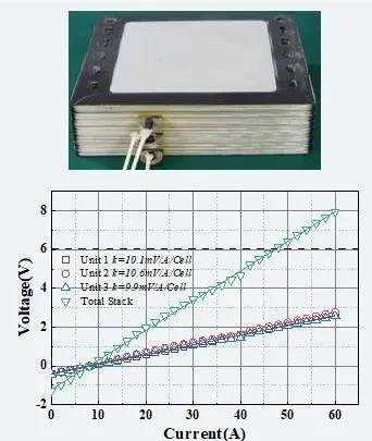 6组重叠单位组成的30片电堆中,电化学性能达到想象筹画(12V@60A),然每组重叠单位的电化学性能一致性稍差,现在在优化电堆结构以罢了重叠单位在整堆中的电化学性能一致性。