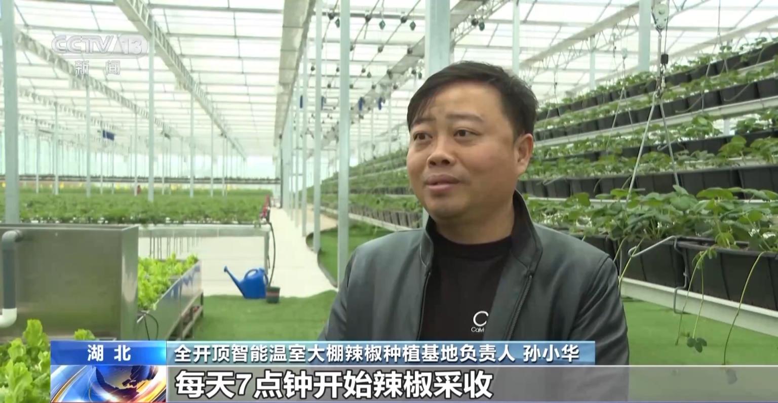 在湖北枝江的全开顶智能温室大棚辣椒栽培基地里,这里的辣椒采收并未受到降温天气的影响。