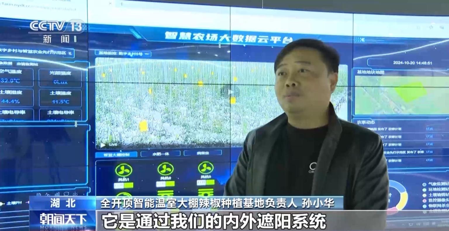 全开顶智能温室大棚辣椒栽培基地精良东谈主 孙小华:湿度、温度和光照强度,它是通过咱们的表里遮阳系统、侧开窗系统以及顶开窗系统,加优势机和湿帘,共同联动智能落幕棚内温度;虫情监测系统能智能判断,针对性驻防。