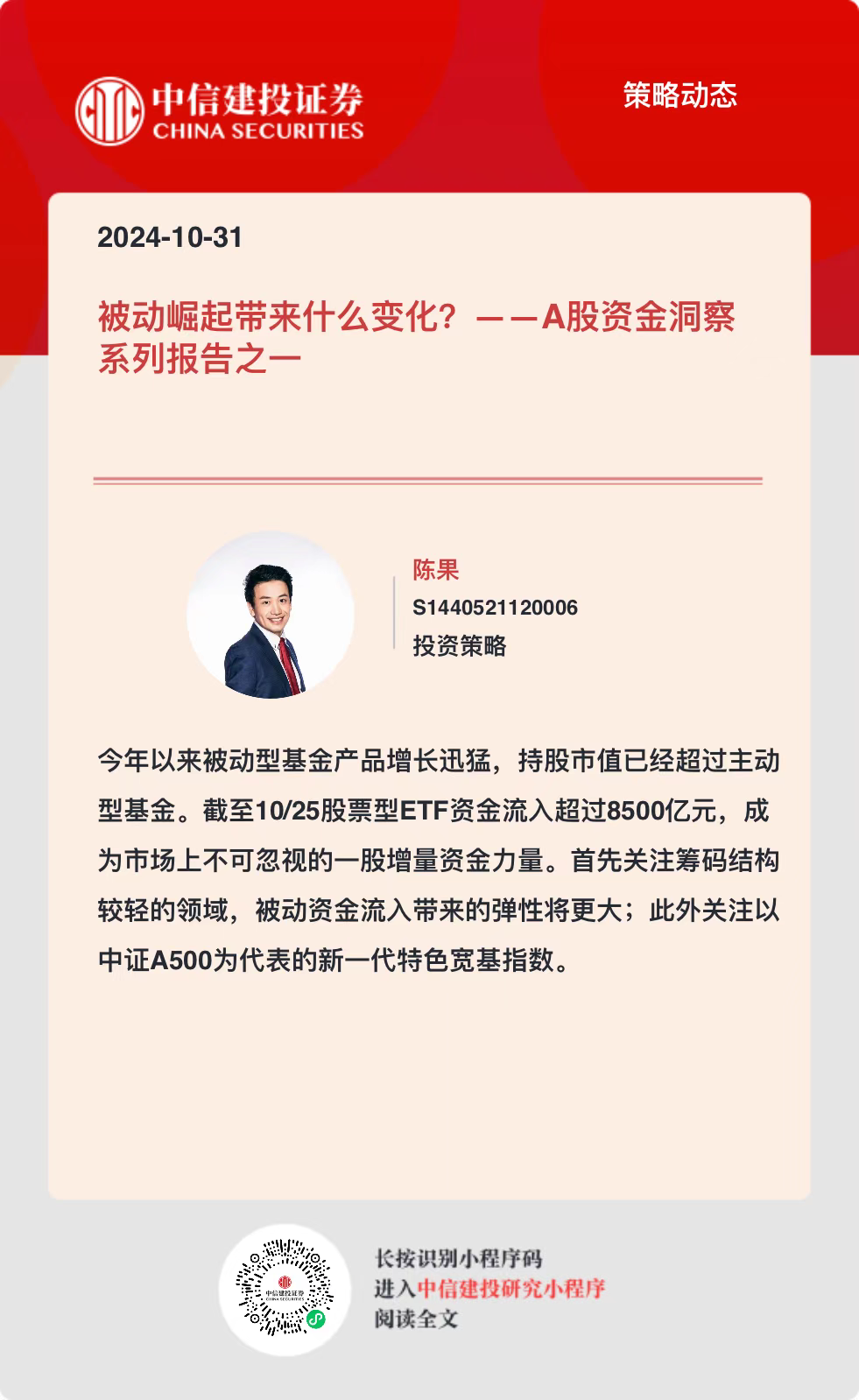 本年以来被迫型基金家具增长迅猛,持股市值依然极端主动型基金。为止10/25股票型ETF资金流入极端8500亿元,成为阛阓上不可冷漠的一股增量资金力量。A股被迫化波涛的降生仍需酝酿,比较之下好意思股被迫化存在多方面成分要求。国内情况来看,个东谈主投资者需要得益效应触发,偏好成长格调、行业主题型家具;机构投资者偏好大盘格调家具,保障机构可能提供可不雅的增量资金。在现时的被迫化进度中,率先温暖筹码结构较轻的规模,被迫资金流入带来的弹性将更大,2022年以来“权重非重仓”组合高潮13%透露亮眼;此外温暖以中证A500为代表的新一代特点宽基指数,若后续资金继续流入,部分行业和个股可能获取更高的资金面弹性。