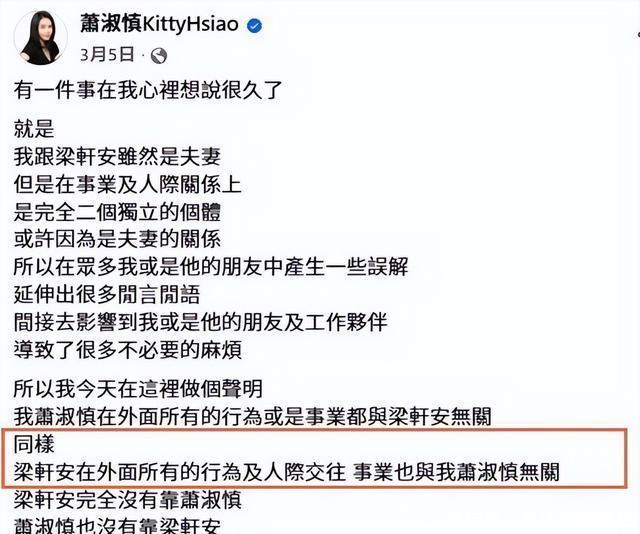 梁轩安开了10分钟记者会, 只说“被蹭热度讹钱”,要告凭空,追问细节时回身就走,还偷偷删了和萧淑慎的合照 。 萧淑慎滥觞直播举着情侣手链说“贯彻恒久”,晒合照力挺,可看到曾密斯的视频片断后,躲在房间哭了一下昼。