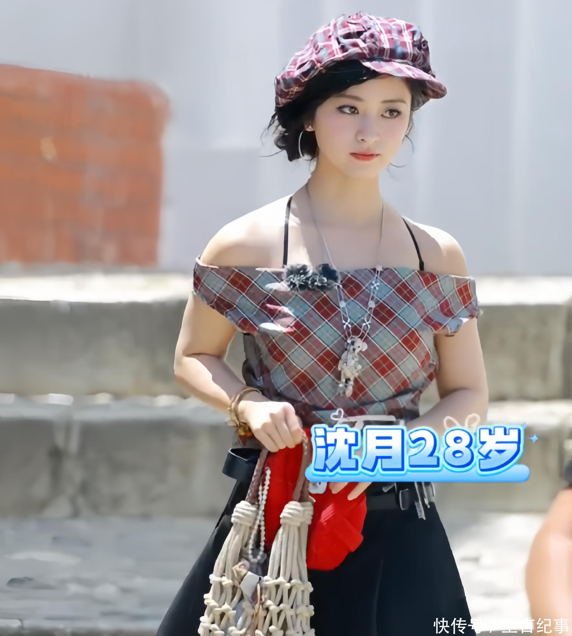 别看沈月腿粗,可穿搭是相称的在线,格子上衣搭配小短裙再配上同款的帽子,没成思在合照中还挺惹眼的。