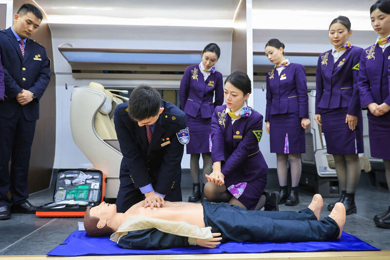 1月28日,江苏南京,“紫金号”G66次列车乘务班组进行急救培训。春运将至,铁路南京客运段围绕职业礼节、客运业务、竖立关节使用、济急料理等方面开展针对性培训,为行将到来的春运打牢基础。视觉中国供图