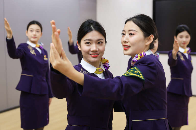 1月28日,江苏南京,“紫金号”G66次列车乘务班组在进行职业礼节培训。视觉中国供图