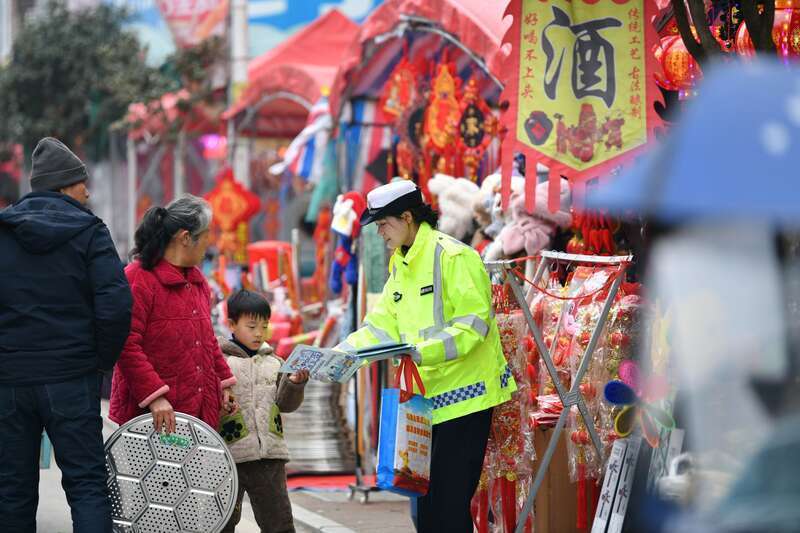 1月29日,安徽省阜阳市阜南县公安局交管大队布道辅警在地城镇年货集市上向专家宣讲春运出行安全常识。2026年春运附进,返乡东说念主员缓缓加多,阜南县公安局交管大队组织布道民警辅警收拢村镇逢集东说念主员出行围聚时机,开展春运交通安全宣传预热活动,升迁专家时髦、安全出行意志。视觉中国供图