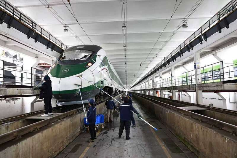 1月29日,重庆车辆段重庆北动集行使车间,责任主说念主员对配属的CR200J动车组进行外部清洁功课。苏志刚/摄