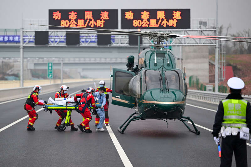 1月29日,G42沪蓉高速成南段,投入演练的消防挽救东说念主员将又名重伤者奉上直升机转送病院救治。2026年春运附进之际,四川省多部门王人集在此处,开展全因素、全实战的济急挽救概述演练。视觉中国供图