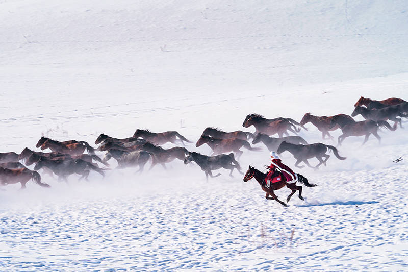 立春后,昭苏湿地公园白皙广大的雪原上,万马奔腾的饰演场景,眩惑大批旅客眼力。